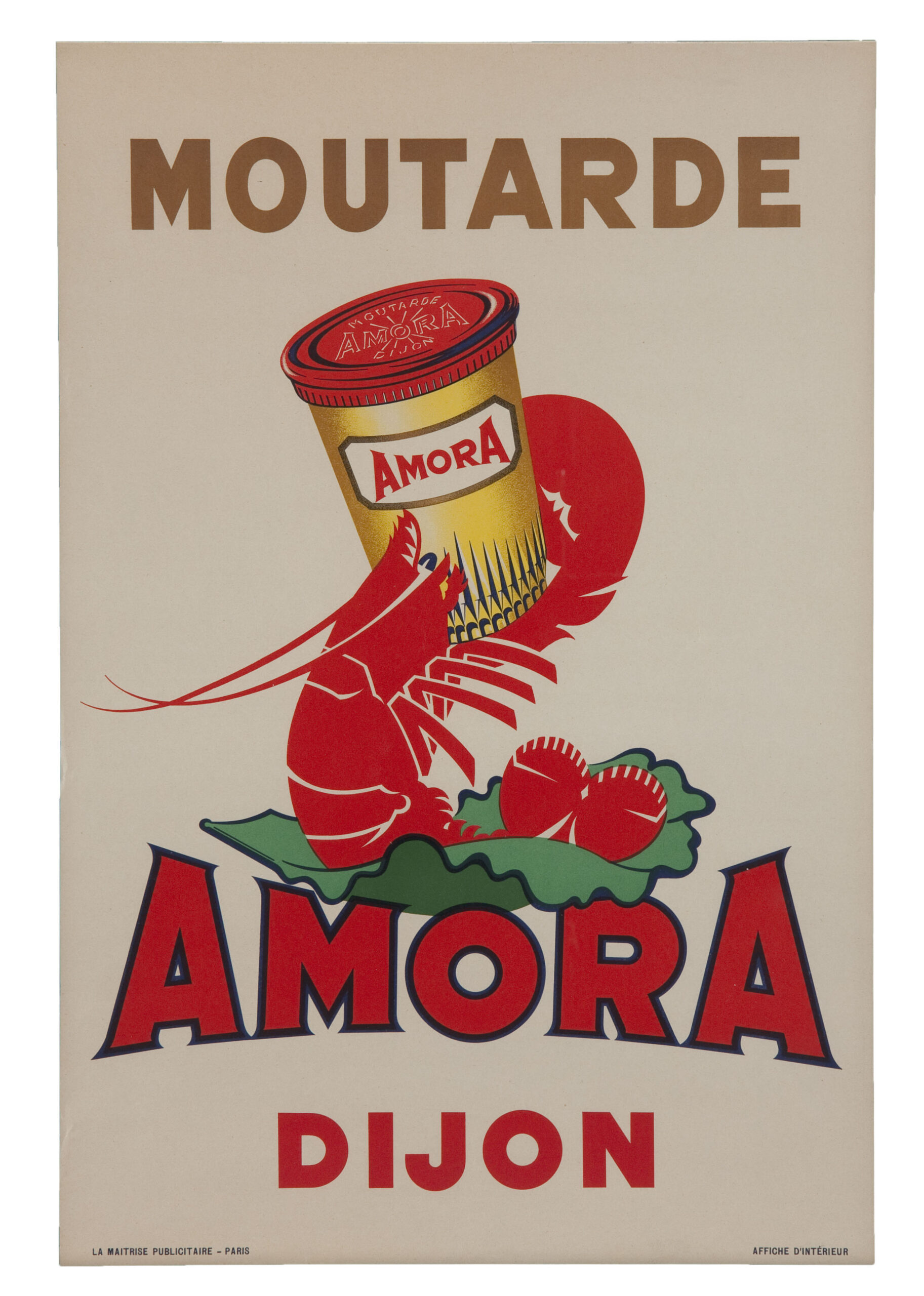 Affiche d’intérieur éditée pour la société « Amora » avec un dessin représentant un homard (ou une écrevisse) posé sur une feuille de salade et brandissant un verre à moutarde « Amora » ; inscription en haut et en bas, marque de fabrique en bas.