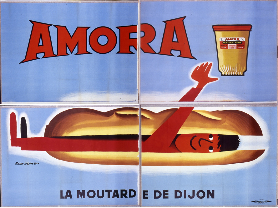Affiche : lithographie sur papier signée par Jean Desaleux. Représentation d’un homme couché entre les deux tranches d’un pain, cherchant à atteindre un pot de moutarde en verre de la marque Amora.
