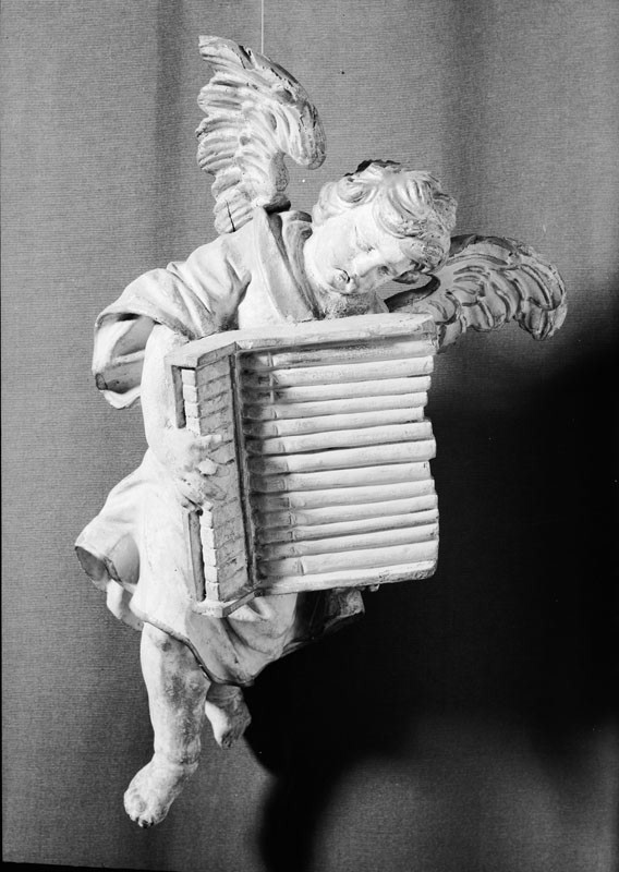 Ange musicien tenant un orgue portatif.