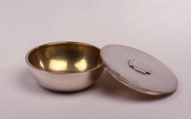 Matière et technique : Boîte à hosties dont le couvercle est en argent, et la base en argent martelé et argent doré.