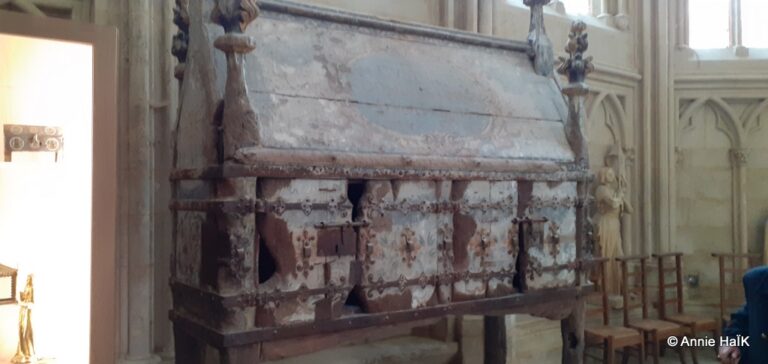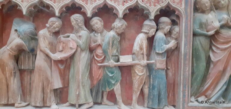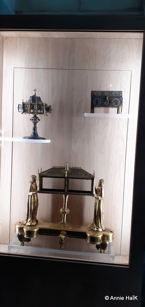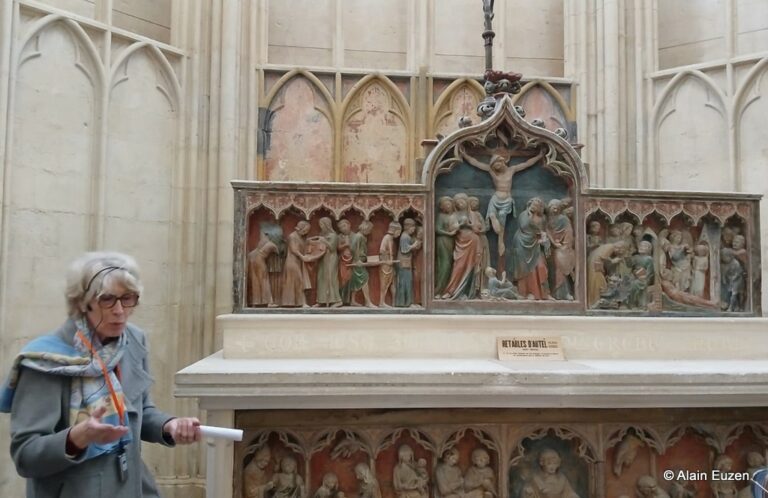 Sur la route du retour, arrêt à l’église de Saint-Thibault-en-Auxois tout récemment restaurée et habituellement fermée au public. Nous sommes accueillis par la Présidente de l’Association des Amis de Saint-Thibault, qui fera une présentation détaillée, complète et très vivante de « son » église, après nous avoir retracé l’histoire mouvementée de ce site religieux qui faillit être rasé au XVIIIe siècle avant d’être sauvé en partie par Viollet-le-Duc. L’architecture exceptionnelle du chœur, impressionnante par son élévation et sa luminosité, abrite un retable en bois sculpté retraçant la vie de saint Thibault, mise en relief par la grande expressivité des figures. D’autres éléments furent admirés comme la colombe eucharistique du XVIe siècle, le Christ en polychrome du XIVe siècle dominant le retable, l’imposante chasse en bois peint renfermant les reliques de saint Thibault, une armoire tout dernièrement installée renfermant des reliquaires en orfèvrerie précieuse ….