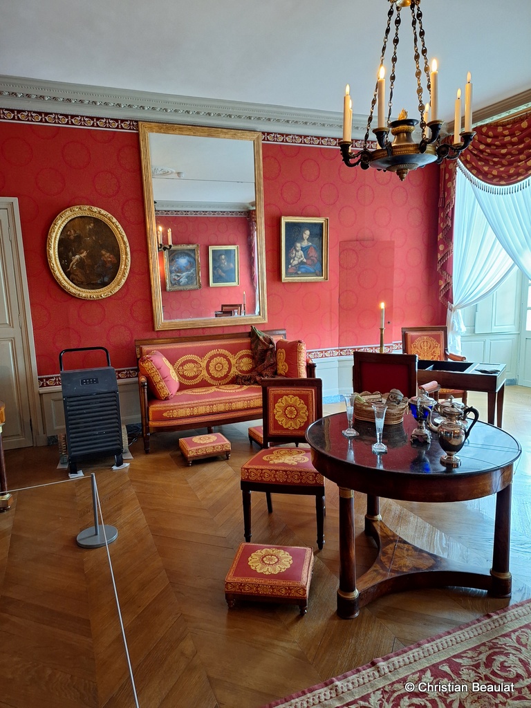 Puis le château se dégrada avant d’être acheté par le comte Jean-Baptiste de Sarcus (1787 – 1875), historien, artiste amateur et collectionneur, qui s’attacha à restaurer le château, le faisant classer sur la première liste des monuments historiques, en réaménageant une partie pour pouvoir y vivre selon la mode et les habitudes de son temps. Ce sont ces appartements qui viennent d’être totalement reconstitués ou rafraichis pour être ouverts au public. Là encore notre visite a bénéficié d’un « guide » exceptionnel puisqu’il s’agissait de François-Xavier Verger, administrateur, entre autres, de Bussy-Rabutin. Son enthousiasme et ses connaissances nous ont permis de savourer ces nouveaux appartements XIXe offerts aux visiteurs