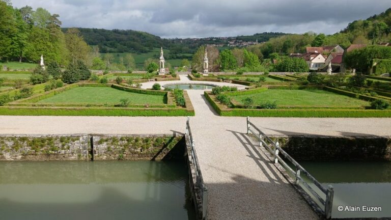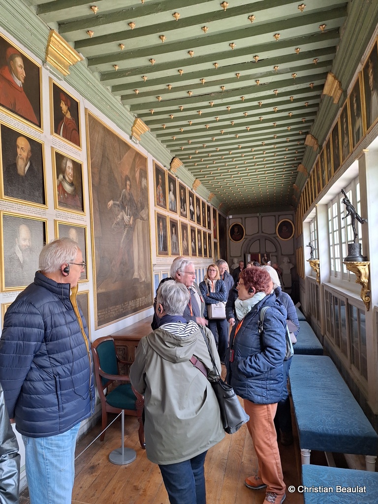 La première étape était consacrée au château de Bussy-Rabutin. Bâti au XIVe siècle avant d’être largement remanié au XVIe dans le style Renaissance, il est situé au fond d’un vallon boisé et verdoyant. Sa façade remarquable a été réalisée au XVIIe siècle par le grand-père de son occupant le plus célèbre, Roger de Bussy-Rabutin (1618 – 1693) exilé sur ses terres par Louis XIV. Il va employer cette longue période de retrait de la cour à redécorer complétement son château pour qu’il soit le reflet de ses sentiments et de sa personnalité.