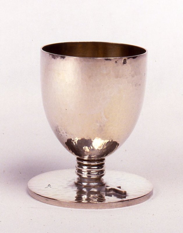 Calice en argent martelé. Pied uni, orné sur un côté d’une croix latine en relief. Tige ronde à quatre renflements. Coupe unie dont l’intérieur est en argent doré.