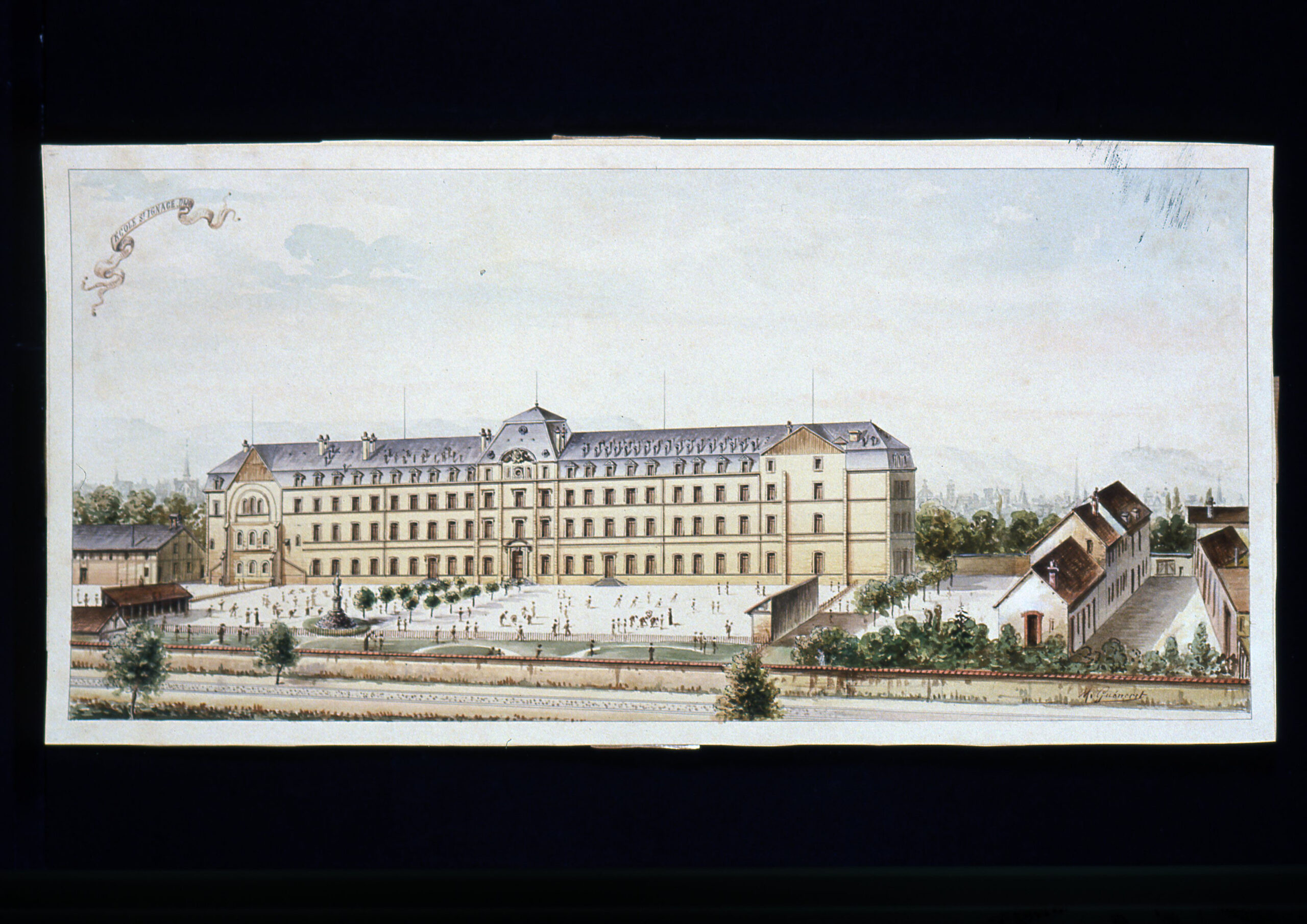 Aquarelle représentant l’École Saint-Ignace, boulevard Voltaire à Dijon : vue de la façade donnant sur la rue ; à droite, ensemble de petits bâtiments ; devant, des enfants jouent dans la cour ; banderole avec le titre en haut à gauche ; signature en bas à droite;