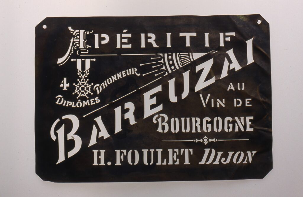Plaque ovale en métal avec inscription découpée pour pochoir.