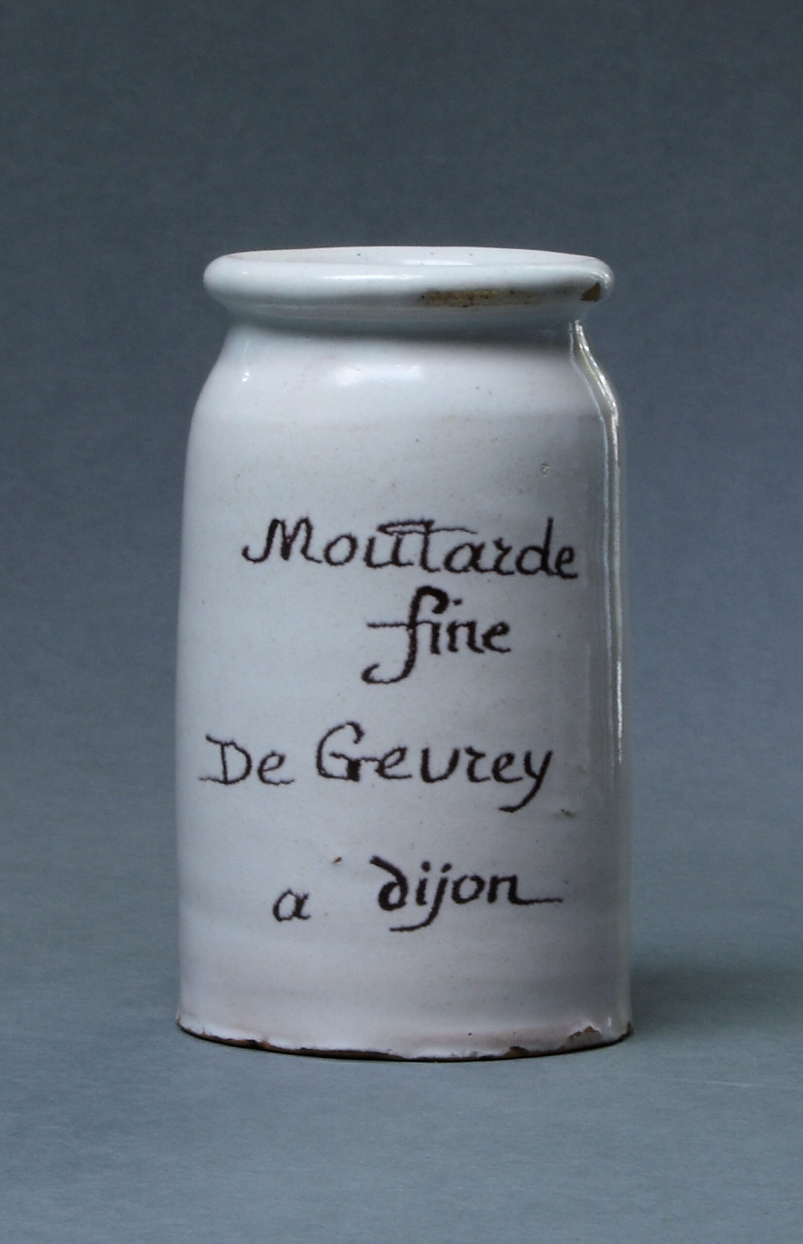 Pot à moutarde de type 1B, en faïence à décor de grand feu ; pot droit cylindrique, collerette plus ou moins tronquée. inscription au pochoir en manganèse