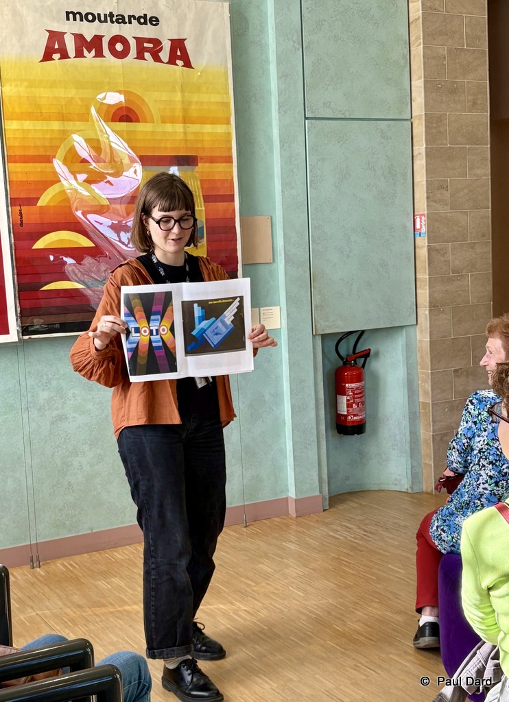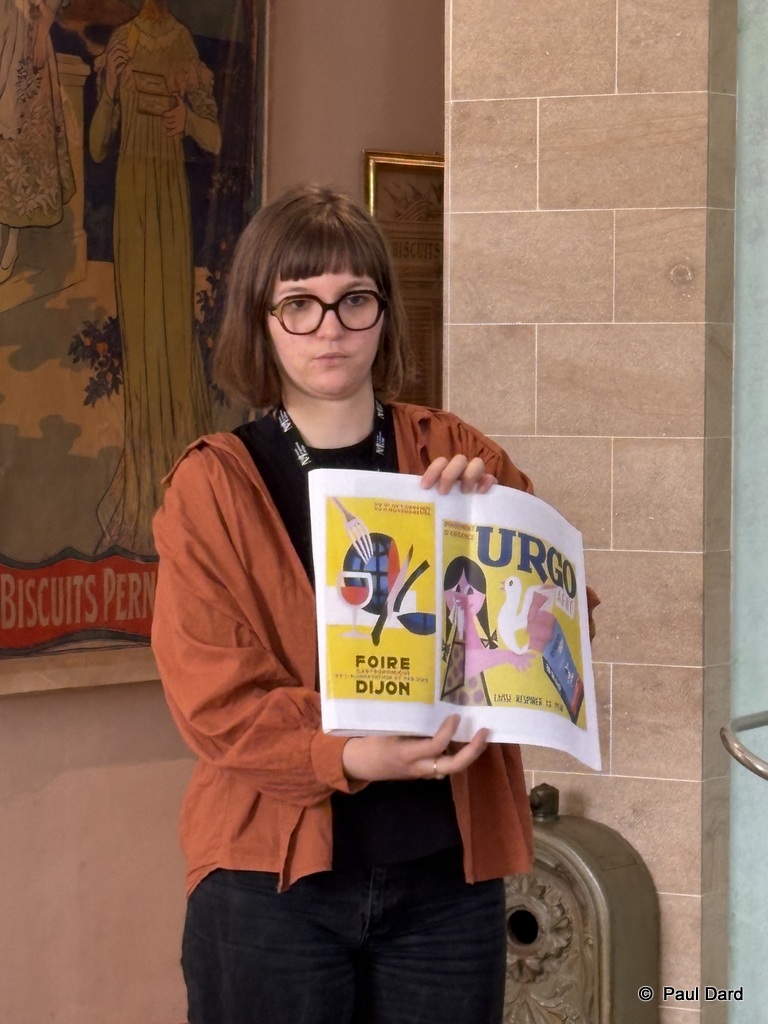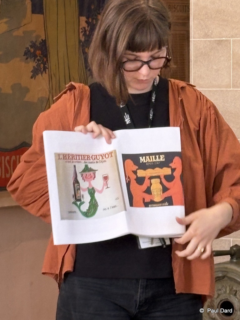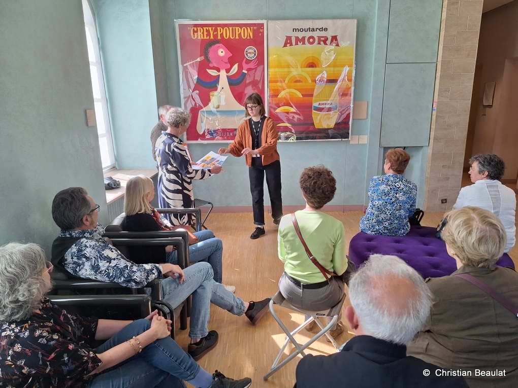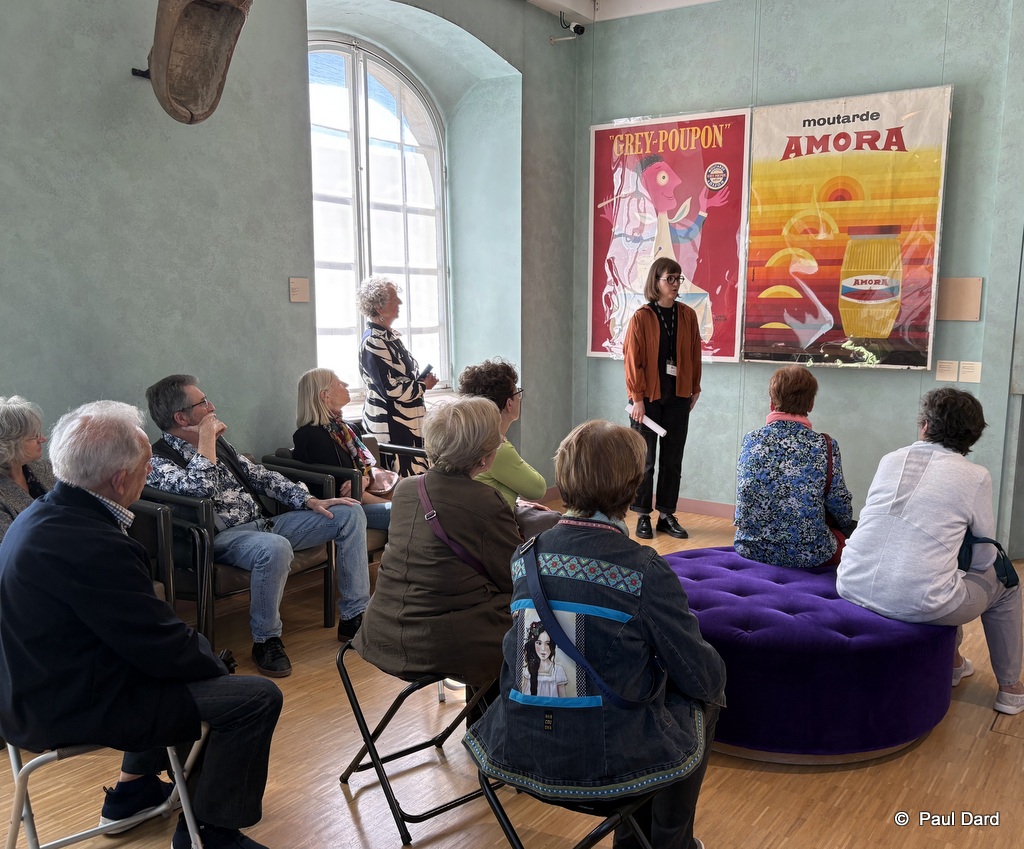 Vicky Buring, la conservatrice, nous a brossé l’Histoire de l’Affiche qui débute sous François 1er, d’abord au service du pouvoir, ce média s’est développé au fur et à mesure de la diffusion de l’apprentissage de la lecture. Mais c’est au XIXème siècle, avec une production manufacturière de plus en plus importante et la création de distributeurs (comme les grands magasins, notamment à Dijon : le Pauvre Diable) concurrents, que l’affiche connaît son âge d’Or. La couleur apparaît et des artistes sont sollicités comme Toulouse Lautrec. L’Art Nouveau, la mode et le cinéma s’emparent de l’affiche. Dans les années 1950, apparaissent des langages divers : l’humour (Raymond Savignac parle d’un « gag visuel »), le symbole, la revendication (Mai 68 par exemple)…