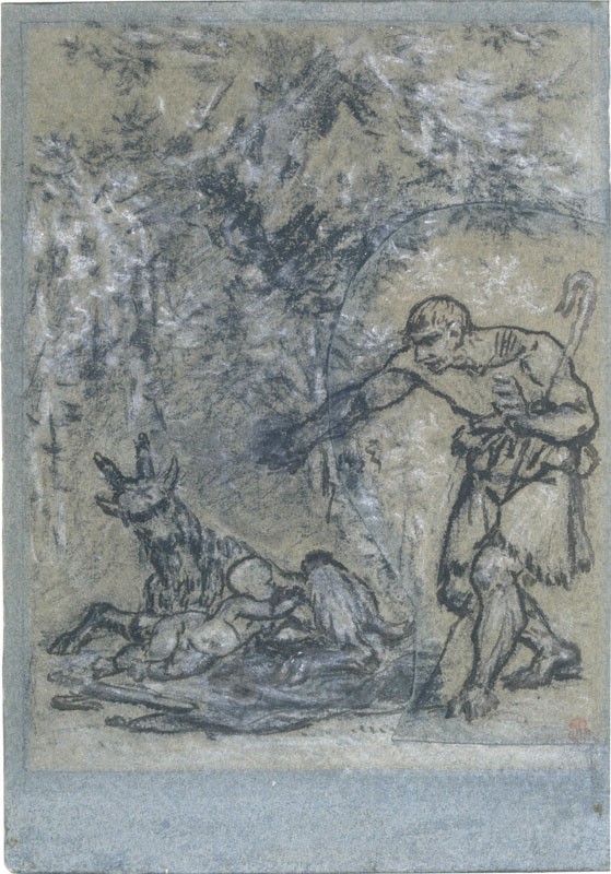 Scène des amours pastorales de Daphnis et Chloé : le pasteur Lamon trouve un petit enfant qu’une de ses chèvres allaitait, vers 1800, pierre noire, estompe, encre brune et craie blanche sur papier bleu. Don de la Société des Amis des Musées de Dijon en 1994. © musée des Beaux-Arts de Dijon/François Jay.
