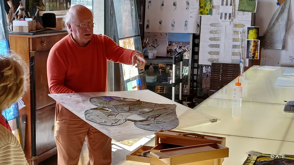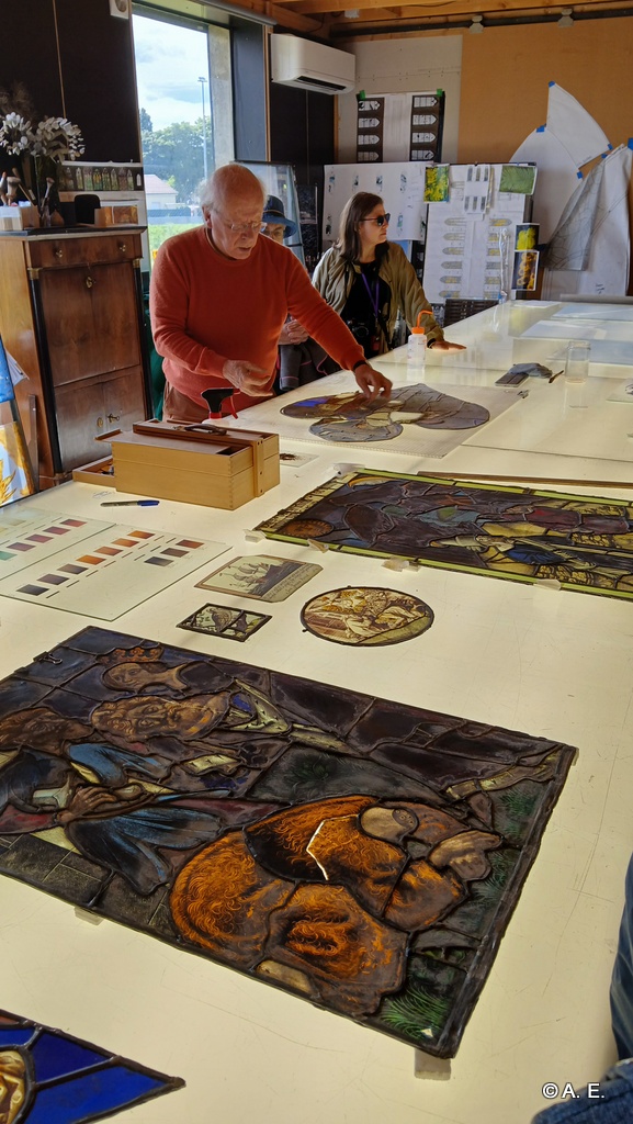 Cette appropriation des techniques du vitrail a été consolidée par la visite d’un atelier, l’un des quatre ou cinq en France à avoir ce niveau d’expertise. Cette découverte, bien trop courte pour faire face à toute la curiosité intéressée des visiteurs, a permis malgré tout de mieux voir les difficultés rencontrées dans la restauration de vitraux endommagés au fil des siècles, le travail de remontage des filets de plomb, le travail du métal pour constituer les supports des vitraux, la découpe au jet d’eau …