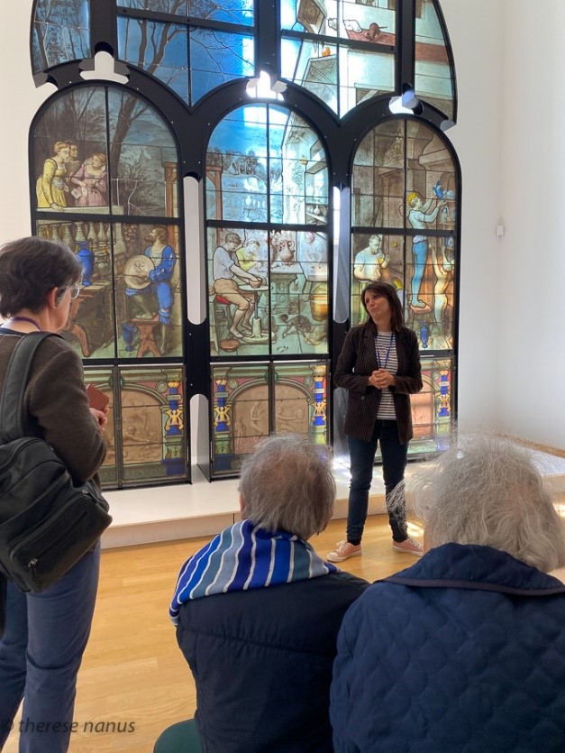 La journée commença par la visite de la Cité du Vitrail, inaugurée en décembre 2022 et installée dans l’enceinte de l’Hôtel-Dieu-le-Comte – fondé par Henri Ier le Libéral, comte de Champagne, au centre de la ville. Sous une magnifique charpente datant de la construction du bâtiment, l’histoire chronologique du vitrail a été reconstituée sur 3000 m2, mettant les œuvres d’époque à hauteur des yeux des visiteurs, qui habituellement ne les voient que « d’en-bas ». La présentation commence par des fragments datés du VIIIe siècle, passe par les vitraux-bijoux du Moyen Age, présente les évolutions stylistiques jusqu’à l’apogée du « beau XVIe ». une vingtaine d’ateliers existaient alors à Troyes. Les différentes techniques de coloration, de peintures des vitraux au fil du temps sont exposées, jusqu’aux innovations techniques et artistiques les plus contemporaines.