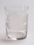 Verre gobelet, blanc, avec inscriptions gravées parmi un décor floral