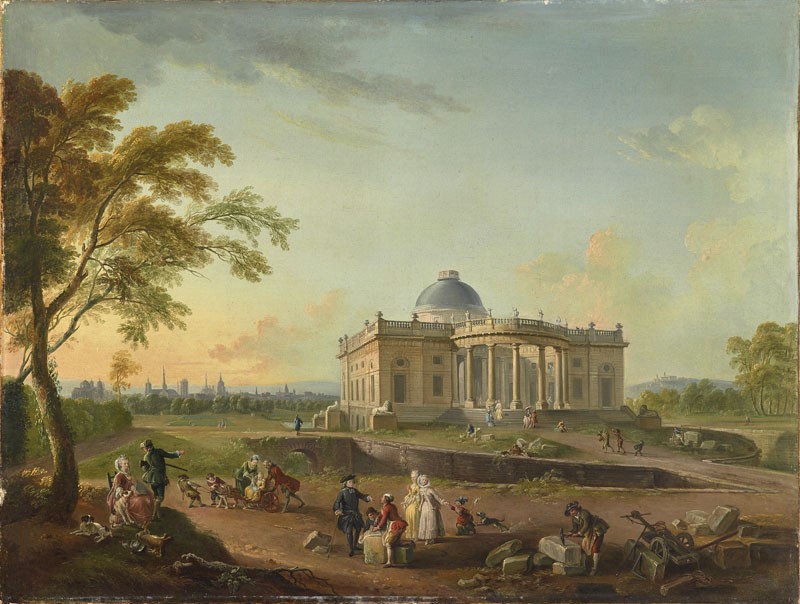 Peintre de scènes de genre et de paysages de fantaisie avec des ruines romaines, Jean-Baptiste Lallemand a également laissé quelques paysages bourguignons, qui constituent de précieux témoignages historiques. C’est le cas de cette vue du château de Montmusard, résidence du Premier Président du Parlement de Bourgogne, Jean-Philippe Fyot de La Marche. Édifiée près de Dijon, autour de 1765, d’après les plans du jeune architecte parisien Charles de Wailly, cette « folie » est l’une des premières manifestations architecturales néoclassiques de province. Son plan original, qui juxtapose deux salons circulaires, l’un couvert d’une voûte, l’autre ceint d’un péristyle à ciel ouvert, vaut à l’architecte une certaine renommée au point d’en proposer des variantes à Catherine II de Russie ainsi qu’au Landgrave de Hesse à Kassel. Mais aucun de ces autres projets ne voit le jour, et le château de Montmusard, dont l’entretien s’est avéré coûteux, est en partie démantelé dès la fin du XVIIIe siècle.
