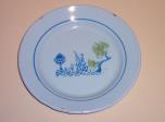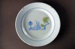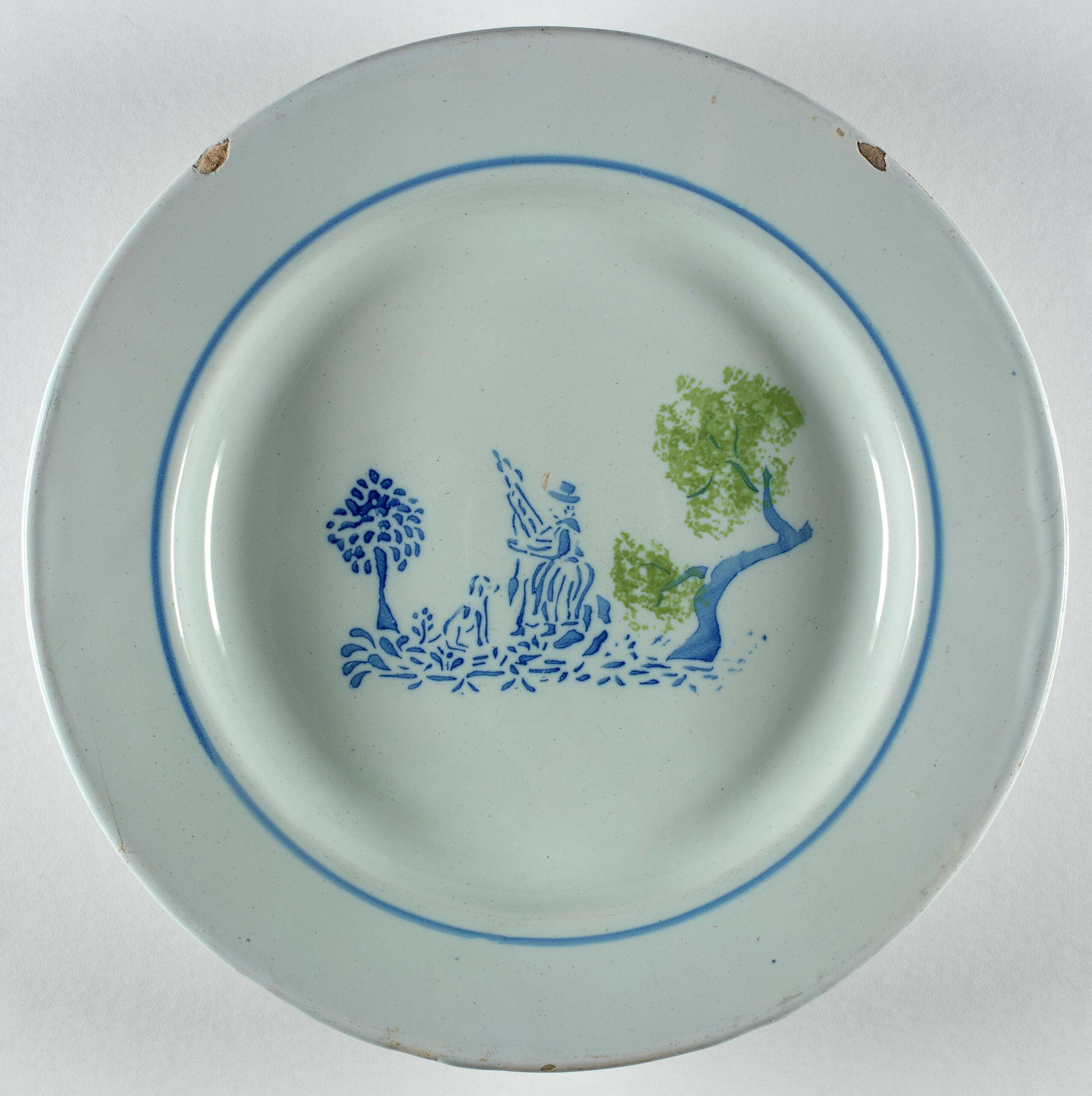 Assiette représentant une femme filant la laine, un chien à ses pieds, près d’un arbre.