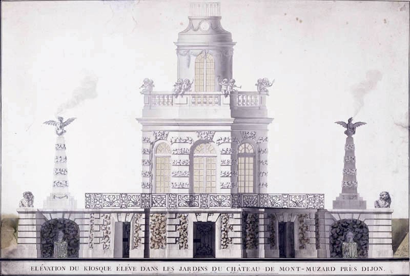 On y voyait en particulier un kiosque octogonal sur un soubassement formant terrasse, d’aspect rocaille, avec ses bossages rustiques, ses riches balustrades, ses obélisques, ses fontaines et ses statues. L’architecte du kiosque, construit en 1748, est inconnu, et le relevé de Charles Saint-Père date de 1766, il est donc postérieur et correspond sans doute à l’époque où l’architecte était pressenti pour édifier le château. (Notice de Sophie Jugie, 1994)