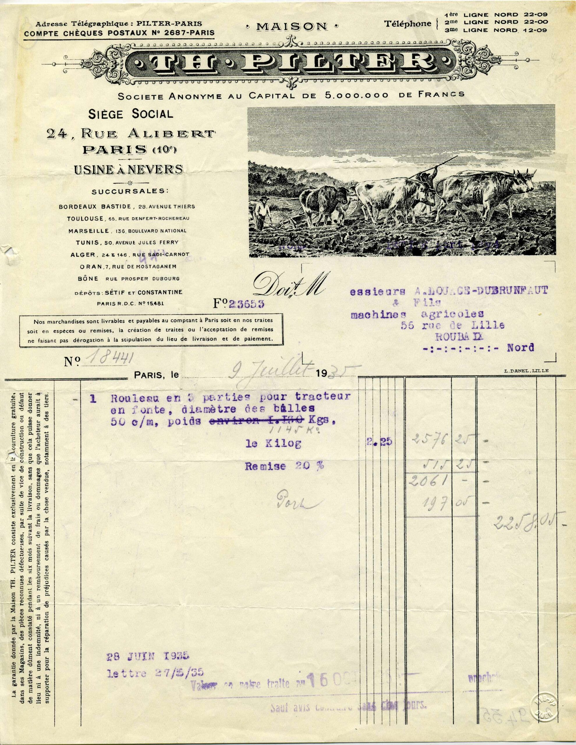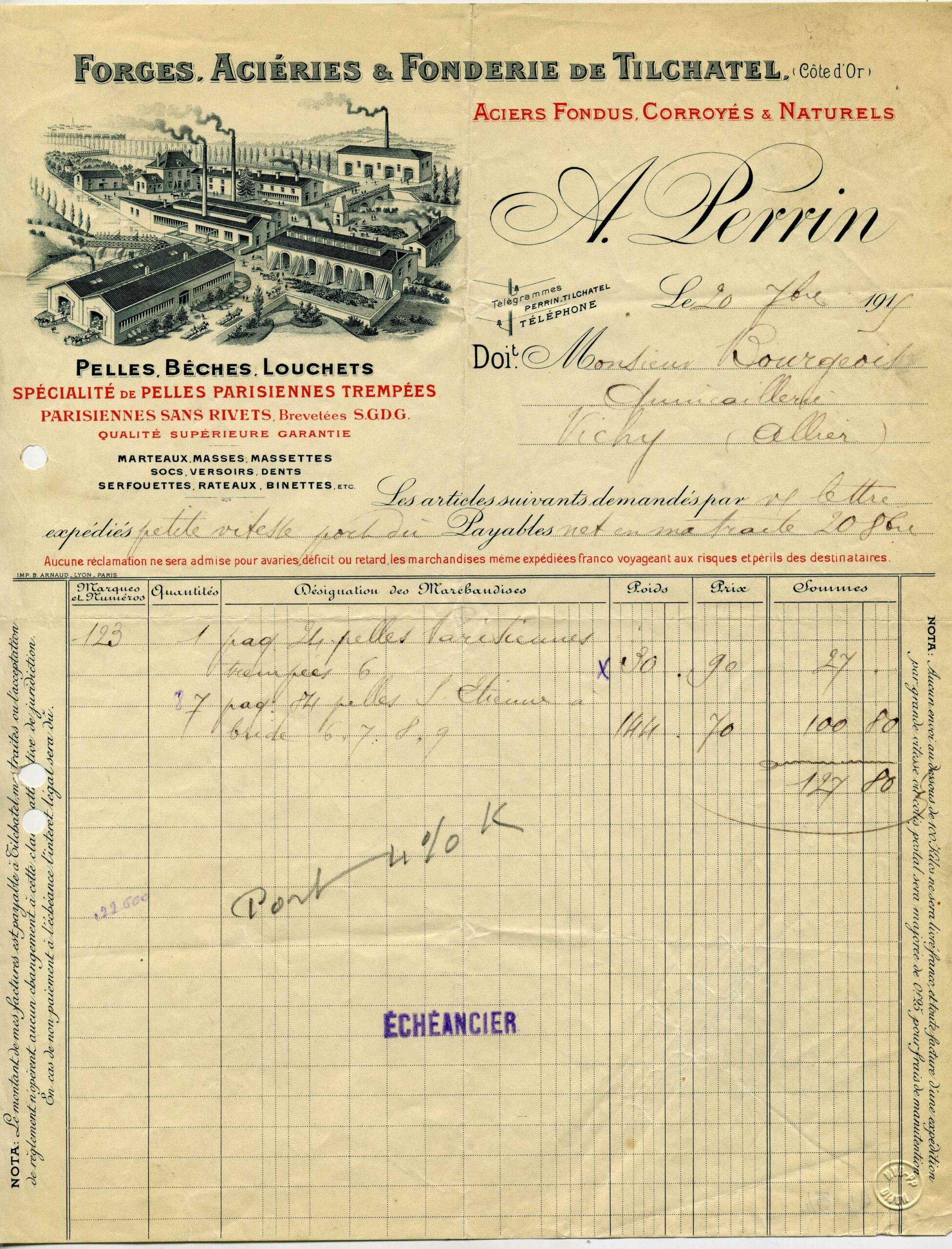 Facture à en-tête publicitaire,avec dessin de l’usine au coin supérieur gauche.