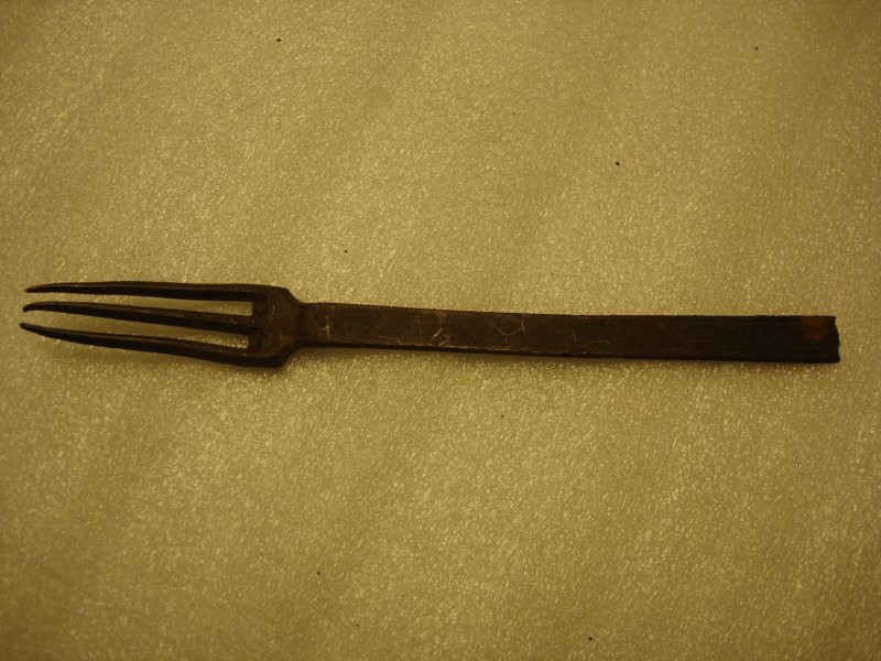 Fourchette à trois dents, manche rectangulaire aplati. Traces d’un sillon autour du manche. Sur le dos à l’extrémité, blason gravé (sans doute aux armes d’un chevalier du Saint-Sépulcre). Poinçon sur le manche, D (?) couronné.