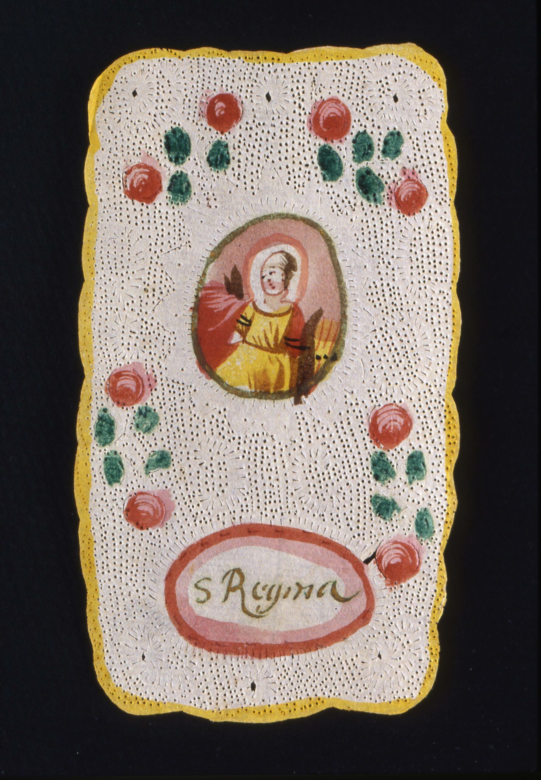 Image de piété, en papier picoté, gouache représentant Sainte REINE entourée d’un filet doré et de quatre séries de deux roses avec feuilles vertes. Inscription dorée entourée d’un double filet sur la partie inférieure. Filet jaune sur le bord.
