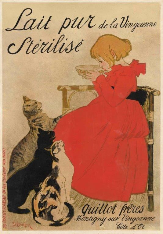 Affiche publicitaire, lithographie couleur représentant une fillette assise portant une grande robe rouge, en train de boire du lait dans une écuelle. Trois chats avides miaulent d’envie à ses pieds.
