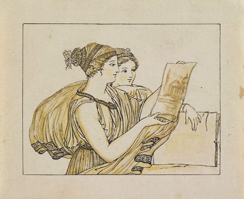 Il s’agit du dessin préparatoire à l’une des dix-huit estampes au trait composées et gravées à Rome en 1792 et regroupées en un recueil dont trois exemplaires sont connus (Musée des Beaux-Arts de Dijon, Département des Estampes de la Bibliothèque nationale, Bibliothèque royale de Stockholm). Ce recueil, l’un des premiers de ce type à paraître, comporte quatre types de représentations : des scènes de jeunes filles vêtues à l’antique, des figures mythologiques, et des pastorales.