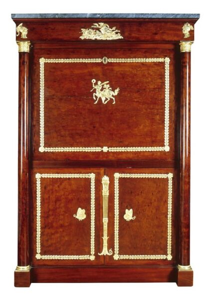 placage d’acajou, bâti en chêne, marbre gris veiné, bronze doré, XIXème siècle (1er quart). Don de la Société des Amis des Musées de Dijon avec...