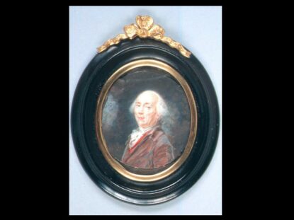 Portrait d’homme âgé de trois-quarts regardant vers la gauche, vêtu de rouge avec un foulard de mousselineMiniature, 18e siècle (4ème quart) / 19e siècle (1er...