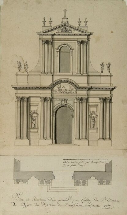 Projet de plan et élévation pour la façade de l’église Saint-Étienne de DijonDessin, 1717Auteur : Jean-Baptiste BOUCHARDON (Saint-Didier-en-Velay , 1667 – Chaumont , 1742). École...