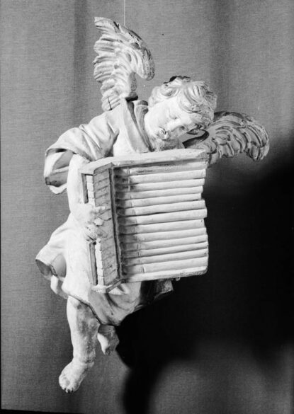 Ange musicien tenant un orgue portatif. Auteur : Anonyme bourguignon, 17e siècle (1er quart). Bois polychrome (blanc et doré). Hauteur : 59 cm ; Largeur...