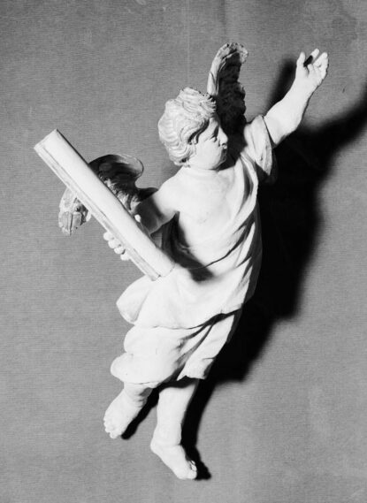 Ange musicien tenant un rouleau.Auteur : Anonyme bourguignon. 17e siècle (1er quart)Bois polychrome (blanc et doré). Hauteur : 62 cm ; Largeur : 30 cm...