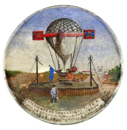 Auteur : Anonyme français, 18e siècle (4ème quart) Peinture à l’huile sur os, Diamètre : 6,3 cm, Inv. Sup 1956-34-OA Dans la nacelle du ballon...