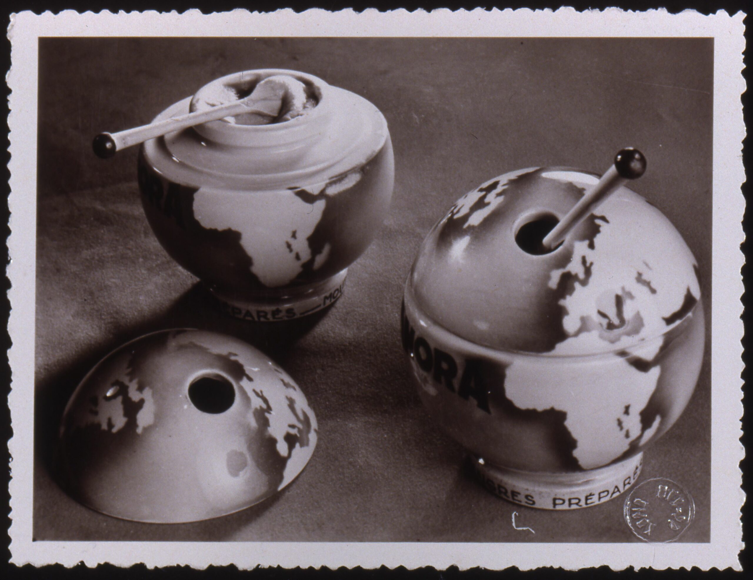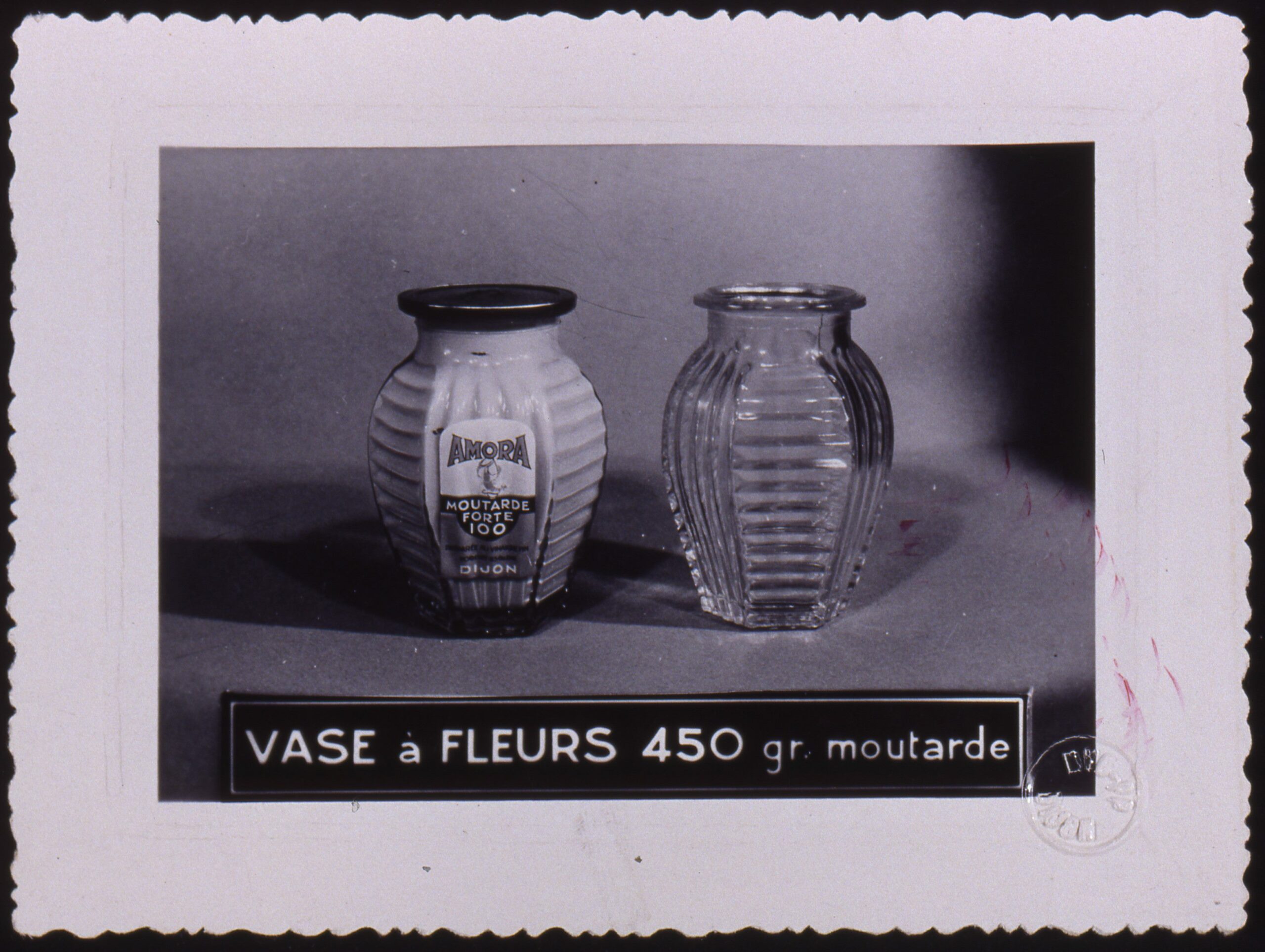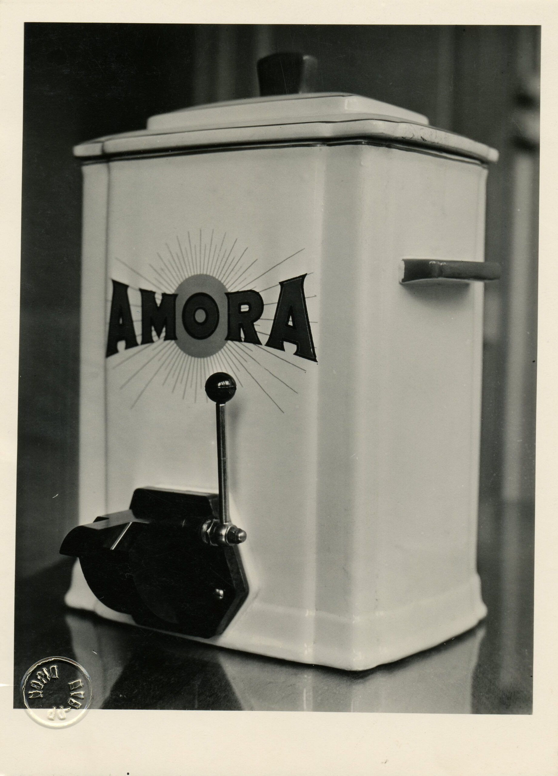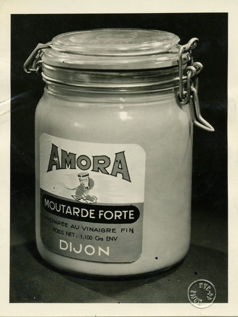 Photographie positif papier monochrome, représentant un distributeur de moutarde AMORA.