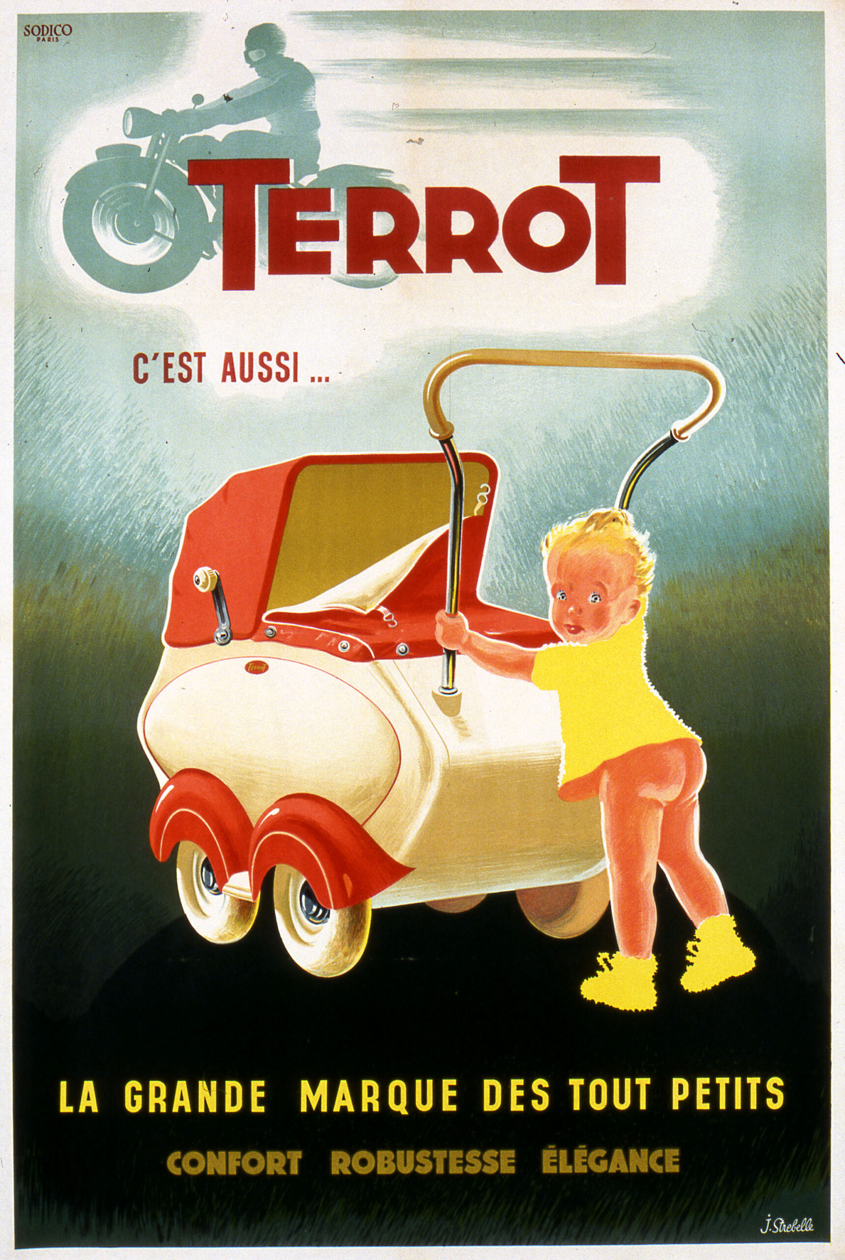 Les articles de la marque TERROT sont très recherchés des amateurs et font l’objet de collections. Le petit enfant blond de l’affiche,  tout joyeux de pousser seul son confortable et profond landau Terrot aux couleurs vives, sans la surveillance de sa maman ou de sa nourrice,  songe t-il déjà que plus tard il chevauchera une moto Terrot, marque  emblématique de l’usine dijonnaise, telle celle que l’on aperçoit en filigrane en haut de l’affiche ? Son petit air espiègle le laisse suggérer au spectateur !